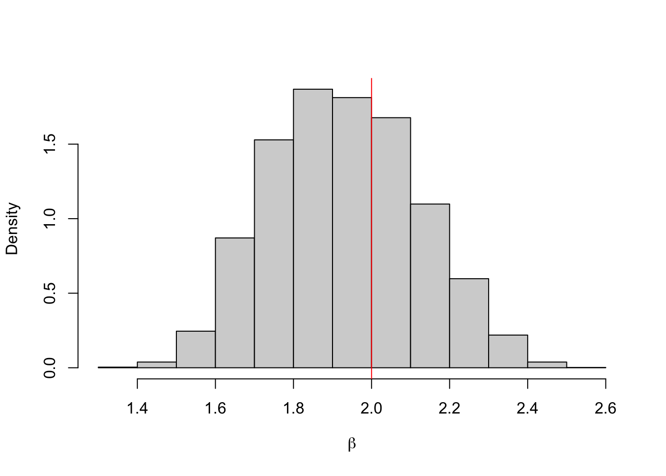 - Compute \(D = \sum_{i=1}^{10}(y_i -y^*_i)^2\). If \(D < 0.75\), accept \(\beta^*\) as a sample from the posterior distribution. Otherwise, reject \(\beta^*\).