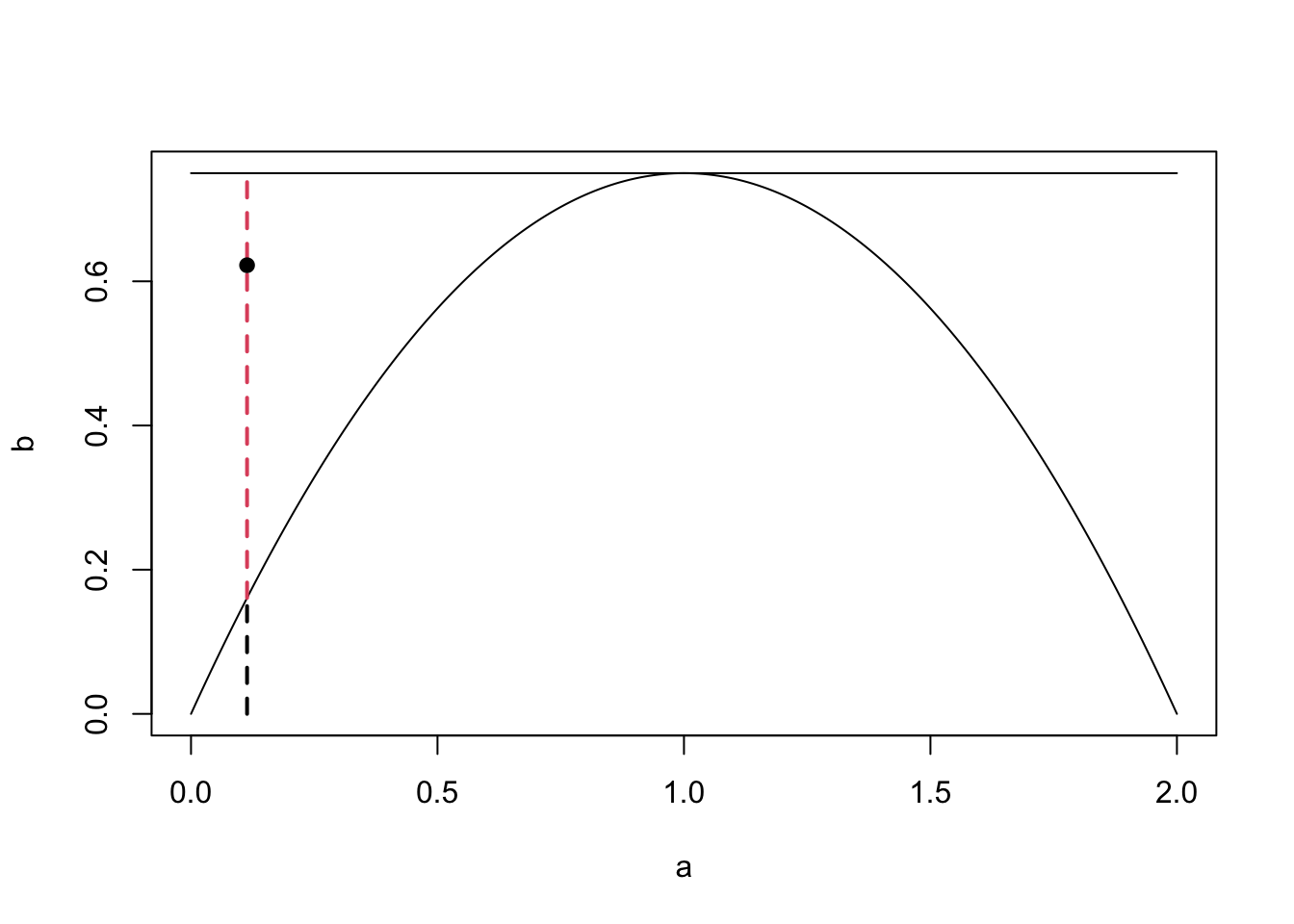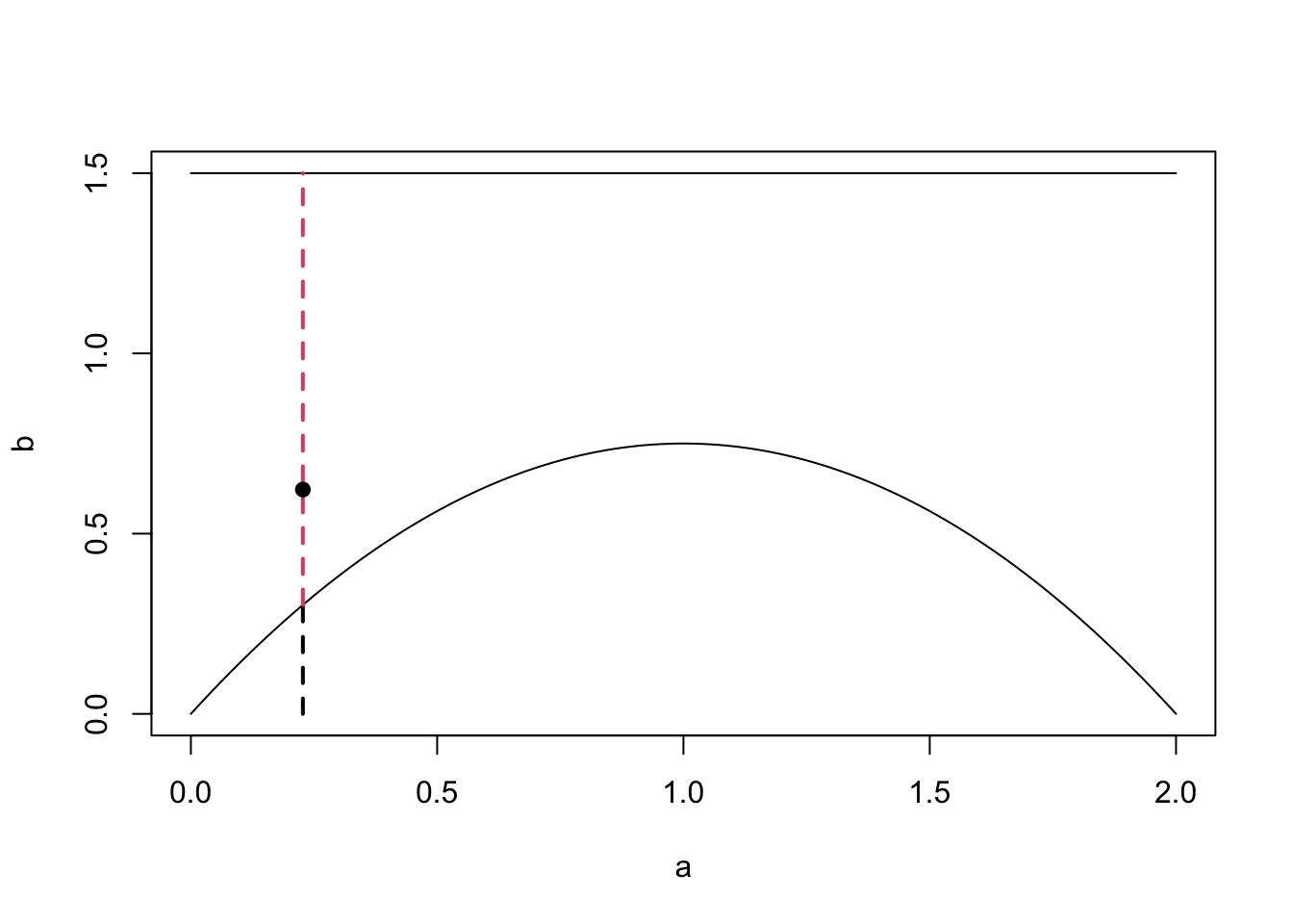 segments(x0 = y, y0 =3/4*y*(2-y), x1 = y, y1 = 3/2, lty = 2,