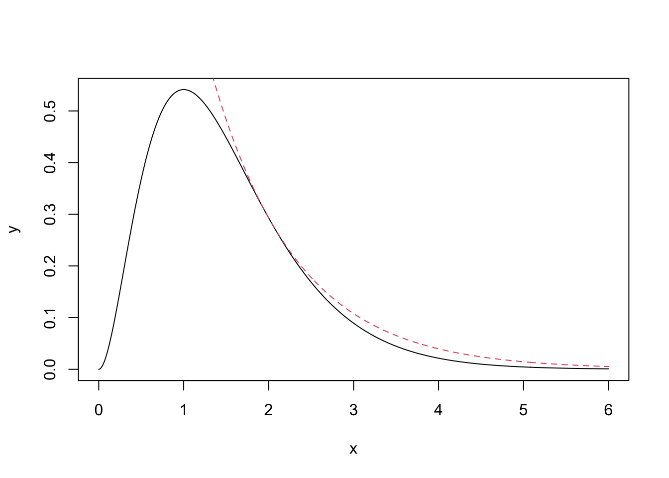 The exponential distribution completely encloses the gamma distribution using this value of \(c\), wiht the two densities just touching at \(x=2\). Our rejection sampling algorithm is therefore